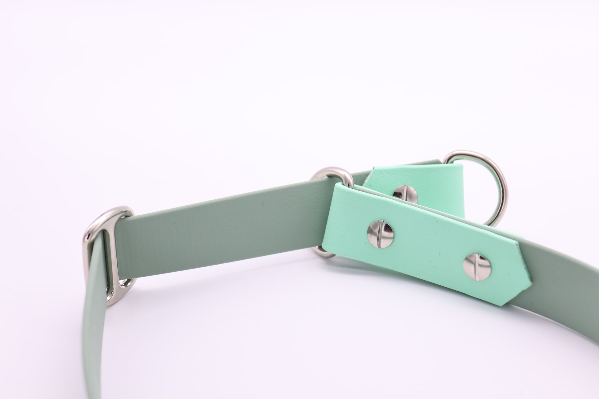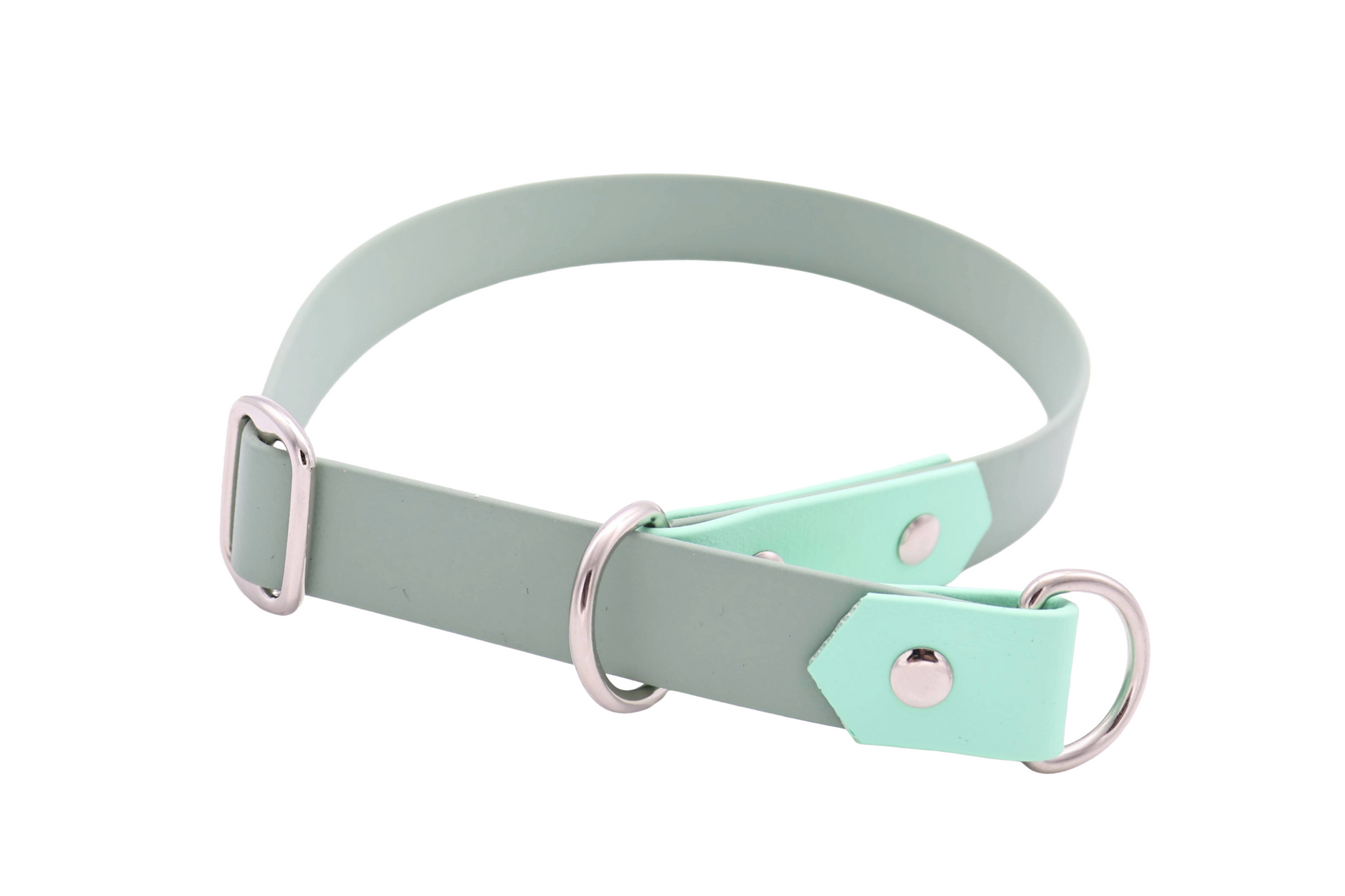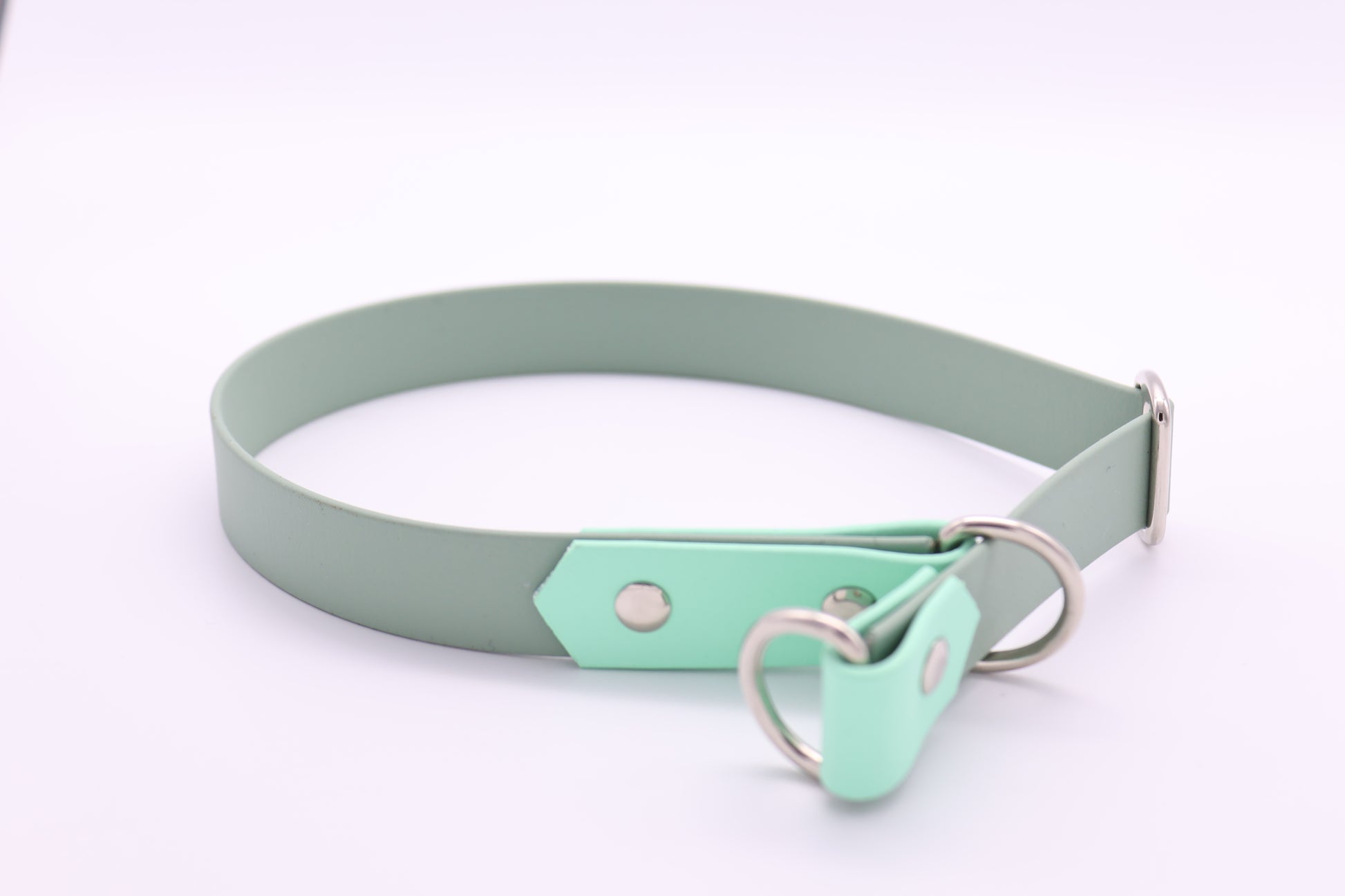 Zweifarbiges Zugstopp Halsband aus Biothane. Robust, langlebig, pflegeleicht, sicher und angenehm zu tragen. Individuell angefertigt.